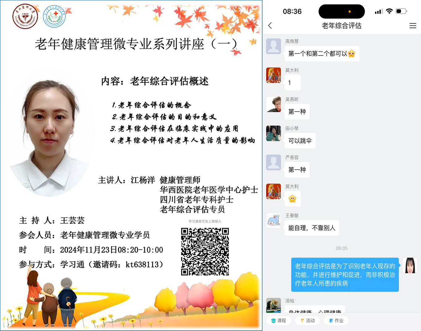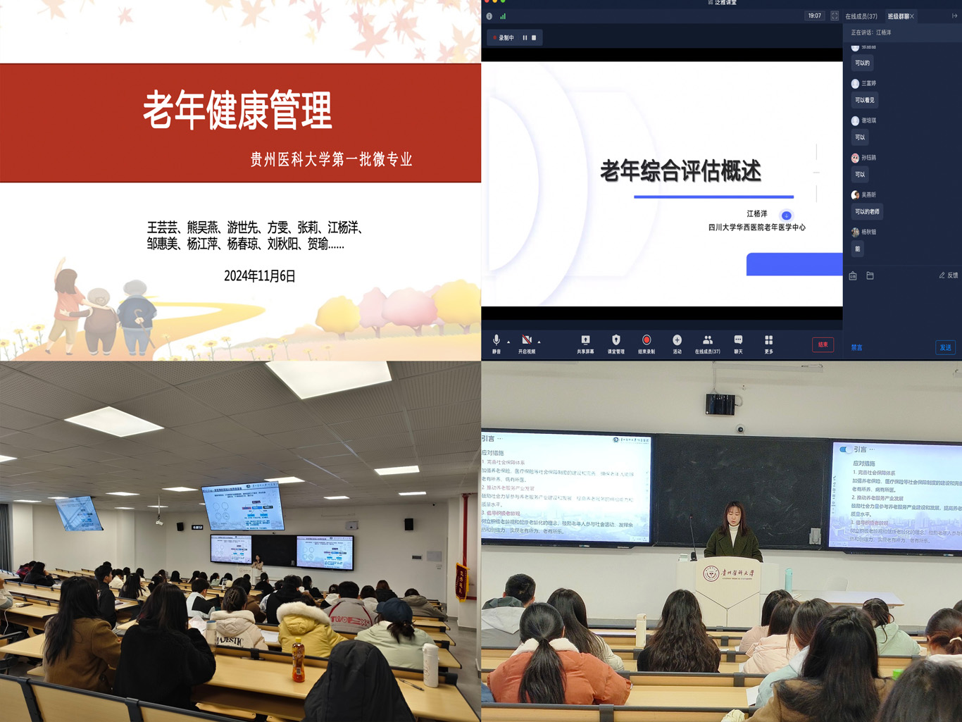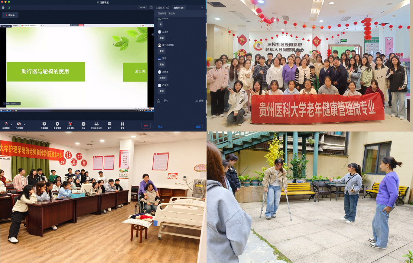11月6日,老年健康管理微专业正式开课,课程内容涵盖了《老年辅具使用》《养老院的经验与管理》《老年综合评估》等实用科目,授课团队主要由美加墨世界杯官方网站专职教师、南明区晚霞彩带老年人日间照料中心的资深团队成员、附属医院老年医学科医护人员以及四川大学华西医院老年医学中心护士组成。