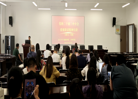 9月23日,为深入学习宣传贯彻党的二十届三中全会精神,深学笃行习近平总书记关于全面深化改革的一系列新思想、新观点、新论断,美加墨世界杯官方网站党委联合公共卫生与健康学院党委邀请马克思主义学院党委书记杜凯教授开展党的二十届三中全会精神专题宣讲,会议由学院党委书记杨英主持,两学院领导班子成员、教职工参加。